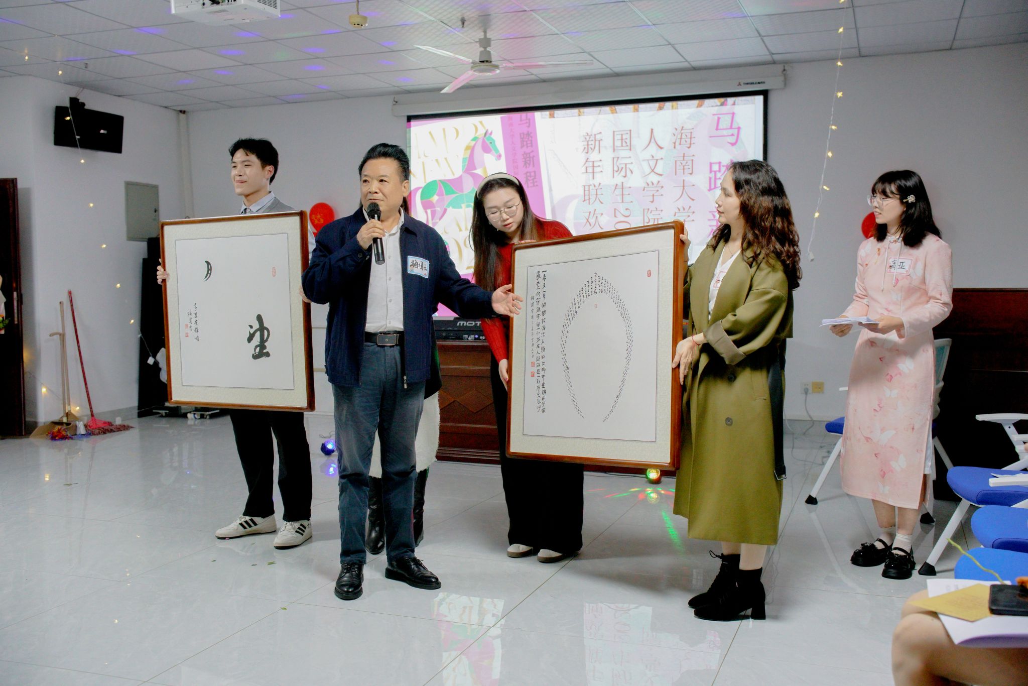 联欢会上,梅国云先生将他的两幅艺术作品赠予学校,表达了海南文化界对国际教育事业的鼎力支持。邀请了廖裕文、敖乌云、敖玉红三位老师作为特邀嘉宾,他们的歌声把晚会推向了高潮。特邀校友嘉宾岳玫瑰女士与海大国际学子们分享了自己的学习经历,对母校的快速发展表示欣喜。