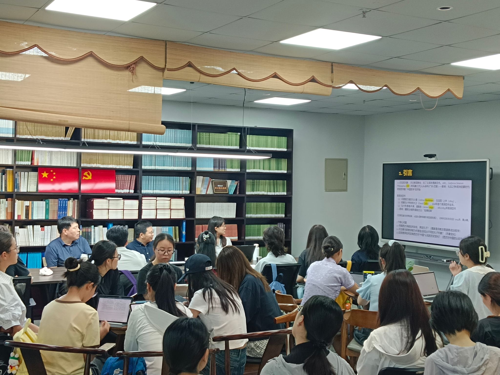 报告会分两部分展开。姚教授先介绍了其在哈佛大学等海外一流大学学术交流的情况。随后姚教授作了题为《儒家四书早期西方译本中的孔子形象》的专题汇报。他以1687年拉丁文译本及19世纪马士曼、柯大卫、理雅各等人的英译“四书”为核心文本,深入分析了明清之际西方学者如何利用丘濬的著作翻译、解释“四书”,并借此介入“礼仪之争”;同时,报告通过剖析各类译本所呈现的孔子形象,揭示了中国思想在早期全球化语境下的多重传播与意义转化。随后,在场师生围绕“丘濬的域外影响”“比较文学研究路径”“儒学的西传和影响”以及“理雅各译经的中国译助和相关文献”等话题展开了热烈的讨论。
