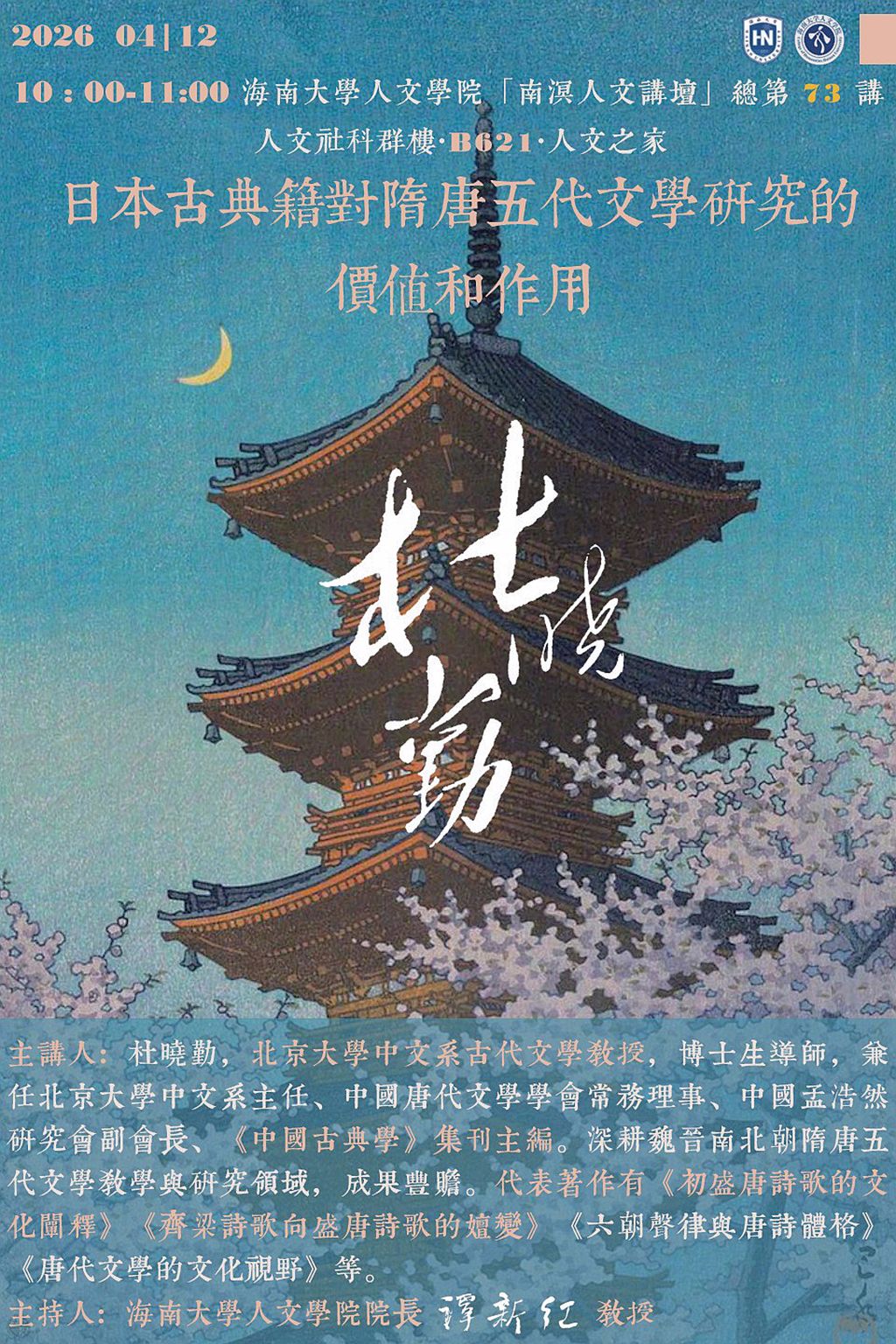 【学术预告】海南大学人文学院“南溟人文讲坛”第73讲 杜晓勤:日本古典籍对隋唐五代文学研究的价值和作用