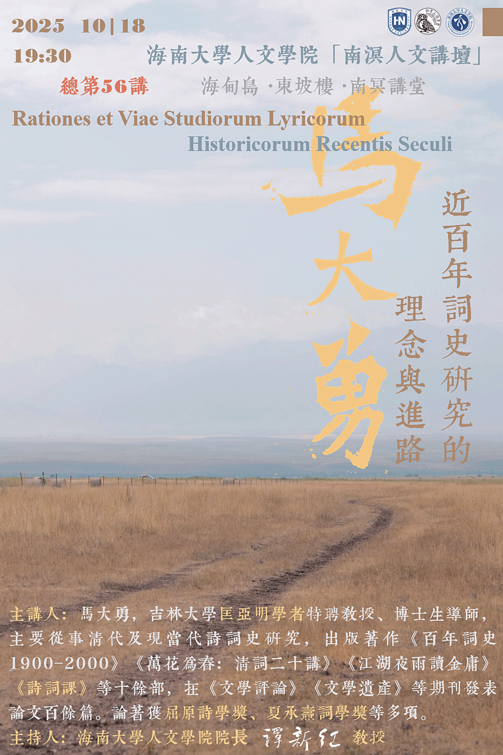 【学术预告】海南大学人文学院“南溟人文讲坛”第56讲 马大勇:近百年词史研究的理念与进路