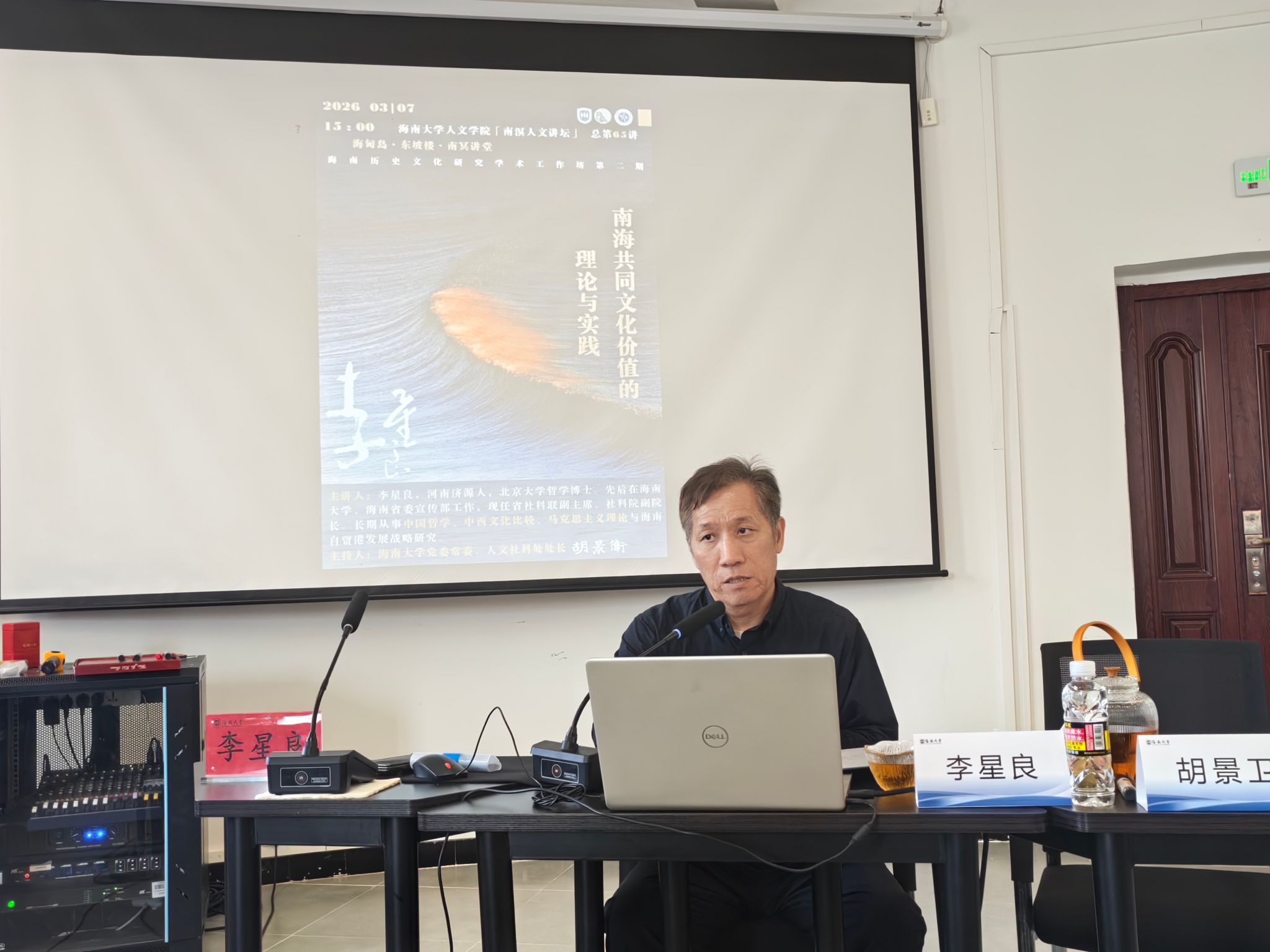3月7日下午,海南历史文化工作坊第二期活动在海南大学南冥讲堂举办。海南省社会科学界联合会(海南省社会科学院)党组成员、专职副主席、副院长李星良应邀主讲,以《南海共同文化价值的理论与实践》为题,解读南海共同文化价值的核心要义与实践路径。海南大学党委常委、宣传部部长胡景卫主持讲座,60余名师生代表现场聆听学习。